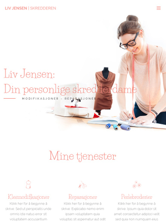 Denne lyse malen er perfekt for alle sydamer og skreddere. Dens splitter nye typografi og skrifttype vil hjelpe deg å gjøre din bedrift unik fra alle andres. Bruk vår godt organiserte tjenesteside for å vise frem tjenestene dine, legg til kontaktinformasjonen din, bilder av arbeidet ditt og hjemmesiden din er ferdig på 1-2-3.