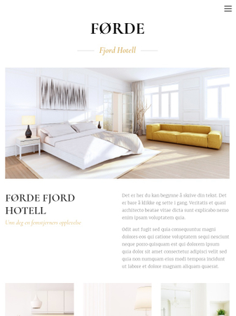 Denne stilige malen er som skapt for din virksomhet enten det er et hotell eller en annet type utleievirksomhet. Malen gjør det mulig å plassere din logo i midten øverst på siden, mens menyen er oversiktlig og lett å finne fram i. Dine gjester finner all nødvendig informasjon og bestiller rom på 1-2-3.