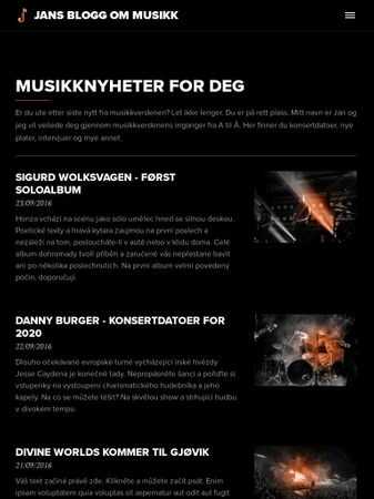 En helt perfekt mal til deg som driver en blogg om musikk. Del blogginnlegg, plate- og konsertanmeldelser, intervjuer og mye mer ved hjelp av denne lekre moderne malen som er utstyrt med en praktisk sidemeny. Hold dine lesere oppdatert på siste nytt fra musikkverdenen.